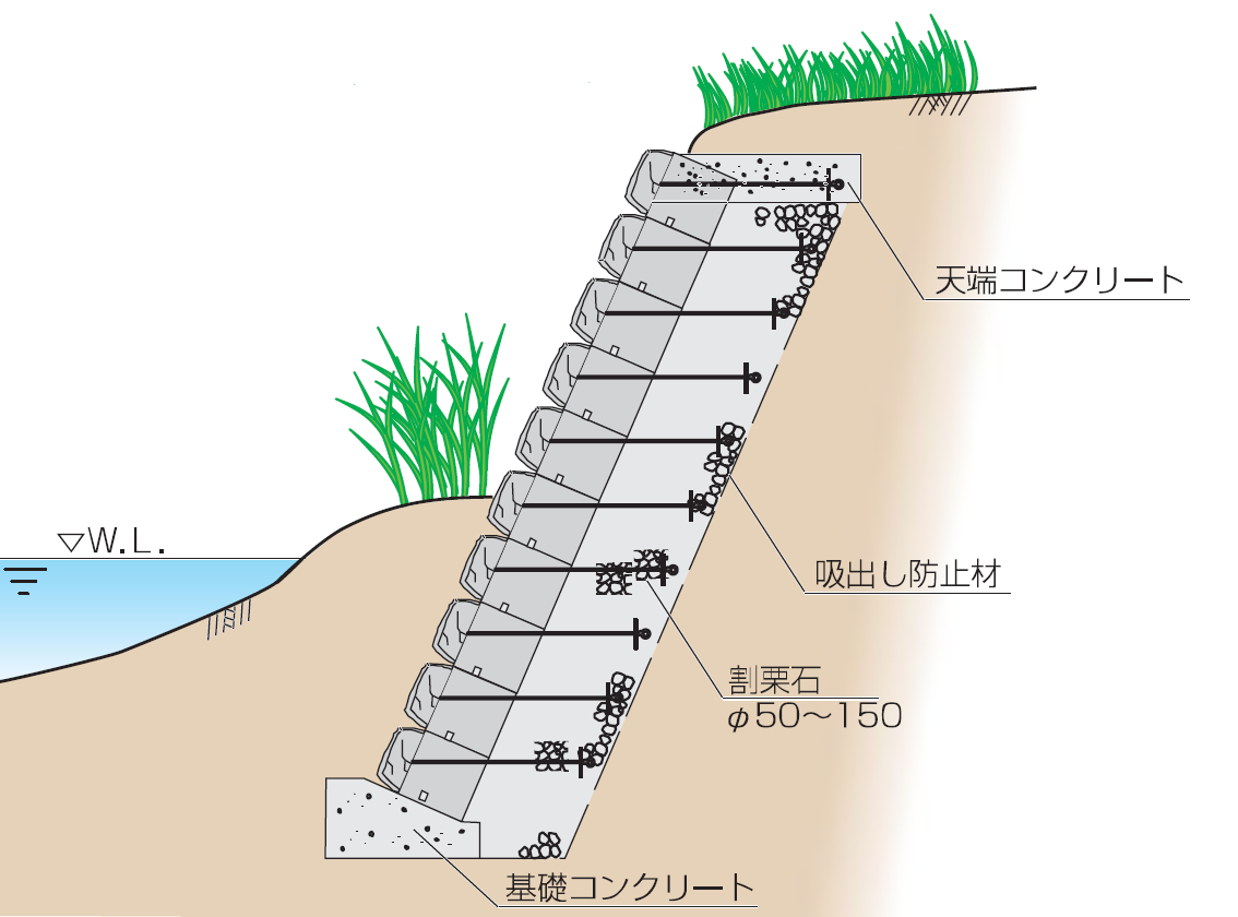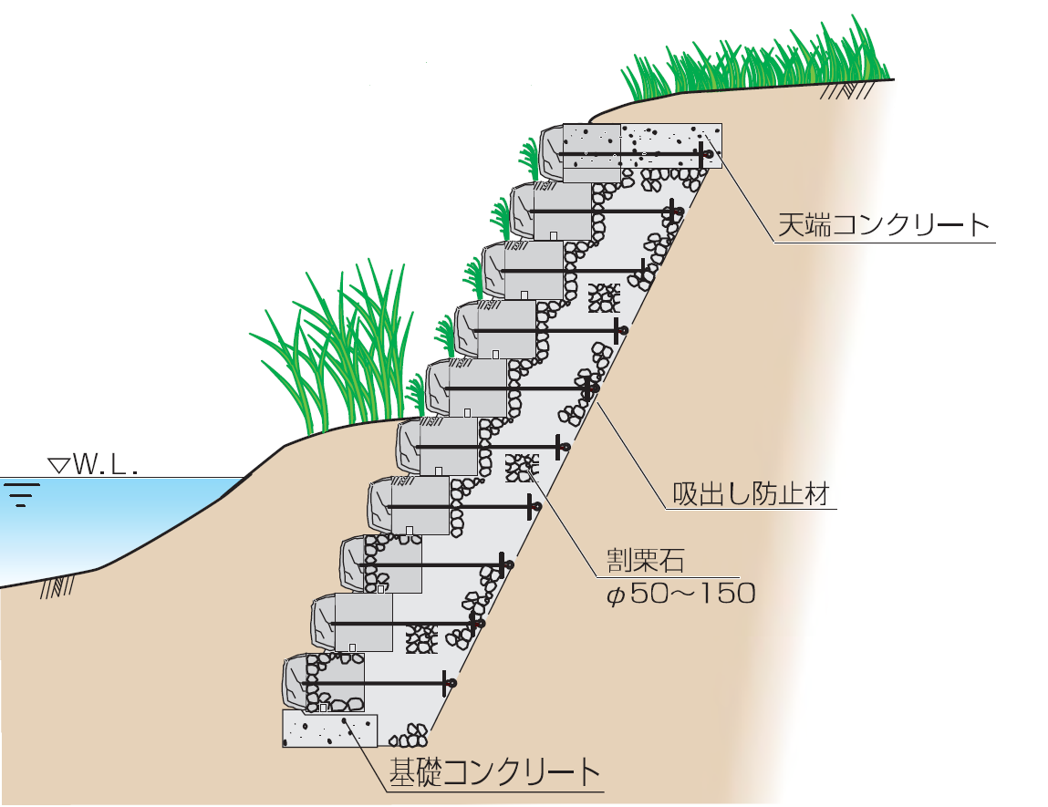 災害復旧工法の「コンクリートブロック積」に対応しており、「災害復旧工事の設計要領」では事例が記載されています。