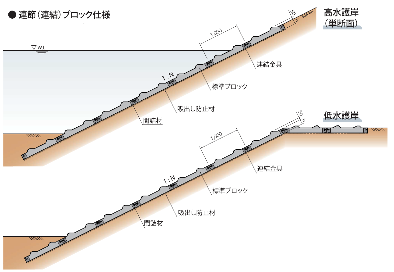 ●堤防表法(低水・高水)に連結ブロックを敷設し、高速流による浸食・洗堀等を防止する経済性に優れた連結ブロック